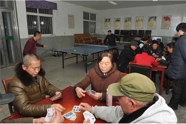 夜晚散步,一跨進位于江蘇農墾淮海農場城東居委會活動室內,頓感這里人聲鼎沸,暖意融融。這邊乒乓球在球拍來回推擋中眼花繚亂,抽殺正酣,那邊一溜排開的3張桌子上擠滿了人,玩著爭上游、摜蛋等撲克游戲。