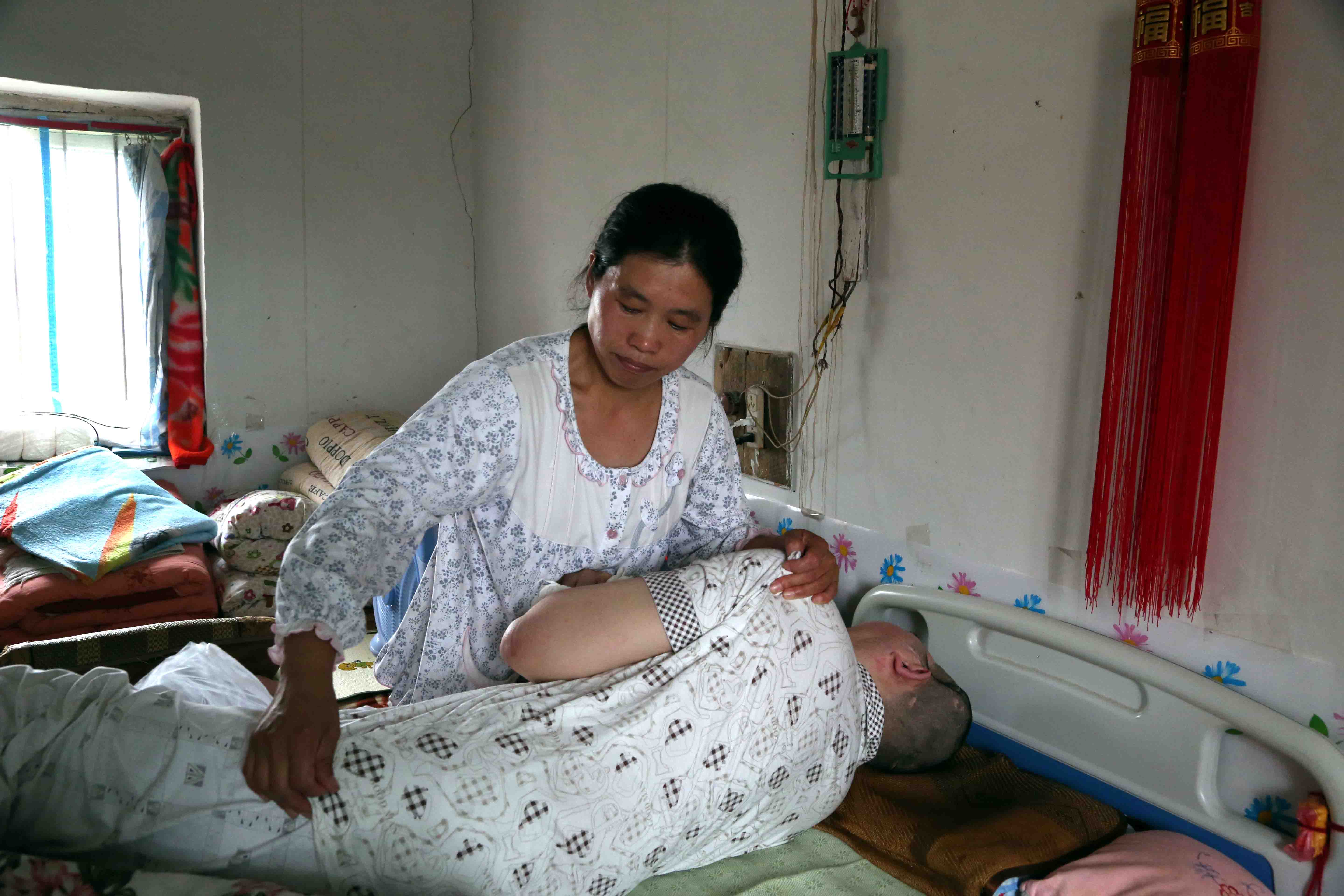 為了全身心照顧丈夫,她辭掉了工作,將丈夫接回了家。照顧病人本就是個苦差事,更何況是要照顧一個沒有意識的植物人,這談何容易。給丈夫喂飯就是王紅面臨的第一個難題,植物人的吞咽能力幾乎為零,只能吃些流食,得靠針筒一點一點的打進去,一頓飯喂下來,她的手麻得失去了知覺。為了給丈夫翻身,她哭過好幾回,瘦小的她經過了無數次的練習摸索才掌握了些技巧,終于不用別人幫忙也可以給丈夫翻身了。