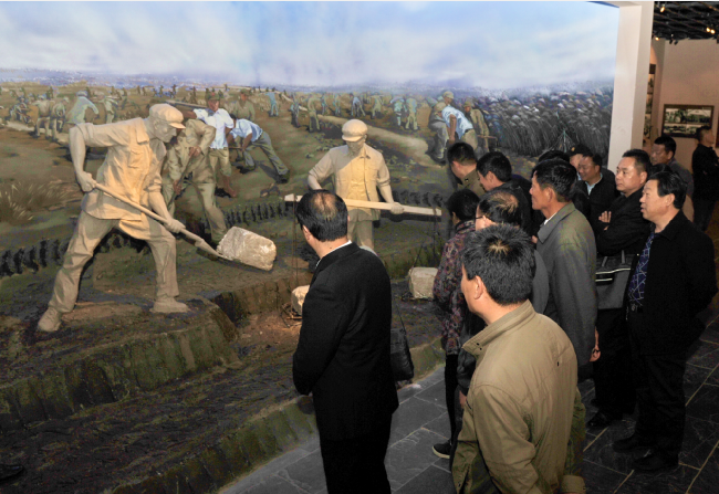 在新征程中勿忘“大鍬、扁擔”,就是要求我們要接過軍墾先輩們的精神接力棒,以腳踏實地的干勁,以舍我其誰的擔當,來為了讓更多的職工群眾能過上美好幸福生活的向往。特別是在時下廣泛開展的“不忘初心、牢記使命”的主題教育中,更需要我們深入貫徹黨的十九大精神,牢固樹立以人民為中心的思想,一切為了人民,一切依靠人民,唯有這樣,我們才能在新征程的道路上,無往而不勝。圖為客人們在農建四師陳列館中觀看以江希友和仇泉原型創作的“江大鍬”和“仇大筐”雕塑模型。