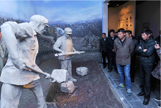 想當年在建場初期的那“三大戰役”中,農建四師的將士們,就是用鍬挖,用扁擔挑的大無畏革命精神,涌現了許許多多像“江大鍬”“仇大筐”式的英模人物。正如陳毅元帥所說的那樣,他盛贊農建四師的廣大將士是“皇帝的氣派(當家作主),叫花子的干法(艱苦奮斗)。當時華東軍政委員會兩次給予通報表揚,中央電影制片廠還專門來到農建四師拍攝了專題紀錄片。2017年陳列館二期工程建造時,為更加形象地弘揚農建四師的“艱苦奮斗、不怕困難、團結奮進、無私奉獻”的精神,主辦方還特地建造了這兩尊雕塑。