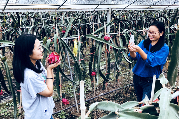 國慶長假,金秋豐收正當時,?港農場新開辟的紅心火龍果有機種植基地進入豐收季,個大飽滿的果實掛滿枝頭,惹得八方游客沉醉其間,先嘗為快。走進火龍果有機大棚,映入眼簾的是一排排仙人掌似的長莖,莖上掛著一顆顆火紅的果子,十分誘人。紅綠相間中,不少游人穿梭其中,或駐足挑選,或拍照留戀,歡聲笑語,甜透每個人的心田。 游客說,以前我們都是在電視上面看到過火龍果,至于火龍果怎么長的,我們還沒看見過,今天一來大開眼界,嘗一下,與市場上的口感大不相同,又甜又香。