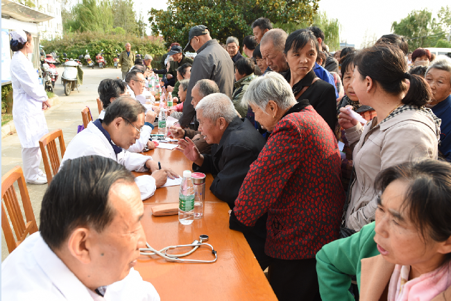 下午2點鐘開始,在淮海農場門診大樓門前,來自揚州大學普外科常見病、多發病和疑難危重疾病的診治專家,醫學博士,外科學教授、主治醫師張培健;內分泌科專家教授、主任醫師丁立;呼吸內科主任醫師蔣有娟;心血管內科副主任醫師嚴俊峰;揚州大學副教授,蘇北人民醫院中醫科主任醫師,中醫內、兒科專家孫保生;中醫科主任醫師,骨科專家李寧;心理學副教授王慧和副教授、附屬醫院神經外科主任醫師武永康等8名離退休專家一字排開,端坐在條桌前,拉開了為淮海農場社區的廣大職工居民開展義診活動的帷幕。