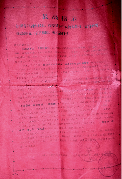 革命的家長同志們!過去,你們曾是知識青年上山下鄉的促進派。今后,相信你們一定會更好地用毛澤東思想教育子女,鼓勵他們扎根兵團干一輩子革命。讓我們更緊密地團結在以毛主席為首、林副主席為副的黨中央周圍,沿著毛主席指引的繼續革命的航道,奮勇前進。