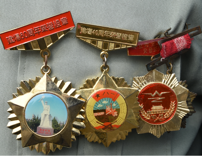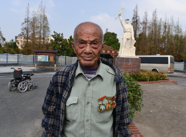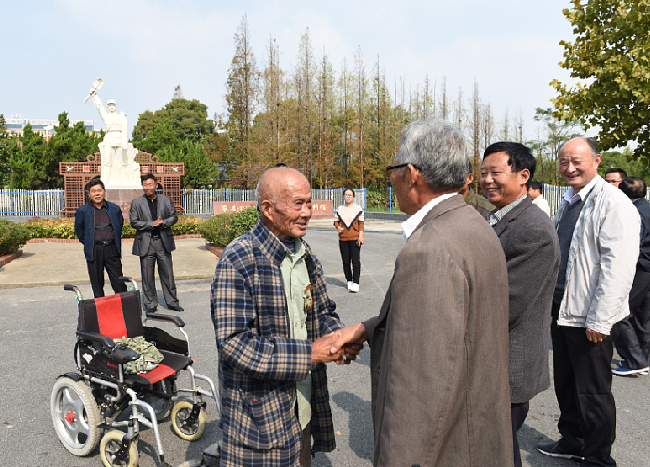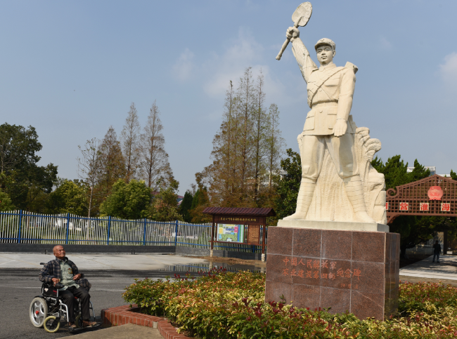 在淮海農場農建四師戰士紀念碑下,每天我們都可見到一位老人坐在輪椅上,瞻仰著農建四師戰士雕像,因老人胸口常年佩帶像章的緣故,這3枚金質像章已經略顯褪色,但從老人堅毅的目光中,仿佛在心中期盼著什么。這個人就是城西居委會振興小區92歲高齡的退休老干部胡鐵成。