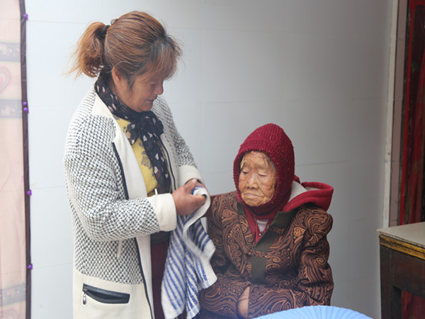 兒子這邊,周萍費(fèi)了苦心,家里的兩位老人,她也盡心盡力照顧。2010年正月,周萍98歲身體一直健康的公公突然中風(fēng)了,可老劉外出打工,兒子在軍校學(xué)習(xí),周萍一時(shí)慌了,幸好鄰居經(jīng)過(guò),看到了,給她叫了輛三輪車(chē),到了醫(yī)院,她二話不說(shuō),背起老人直往病房樓跑,一百來(lái)斤的女子愣是把一百三四十斤的老人背到了三樓的病房,把醫(yī)生都看愣了。但老人畢竟上了年紀(jì),就此癱瘓了。吃穿都不愁,拉撒怎么辦呢?家里又沒(méi)有男人,婆婆95歲也需要人照顧,想到公公健康時(shí)那么愛(ài)干凈,一周都要去浴室洗一次澡,她咬了咬牙,對(duì)著已經(jīng)沒(méi)有意識(shí)的公公說(shuō):“爸,湘林不在家,我就是您親閨女,每個(gè)人都會(huì)老,我照顧您是應(yīng)該的。”過(guò)了幾日,浴室管理員看老人好久不來(lái)特地跑他們家,看到周萍正給老人換尿不濕,問(wèn)人知道是兒媳后直豎大拇指。