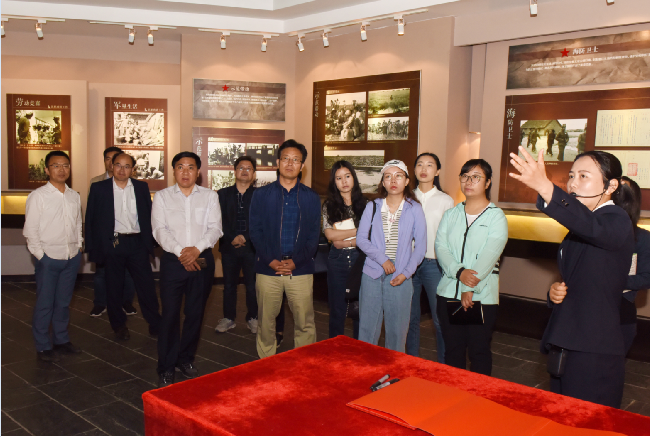 隨后,采訪組一行依次來(lái)到農(nóng)建四師紀(jì)念碑,農(nóng)建四師暨淮海農(nóng)場(chǎng)歷史陳列館等處參觀。農(nóng)場(chǎng)公司領(lǐng)導(dǎo)和陳列館講解員詳細(xì)地向新聞媒體采訪組一行介紹了軍墾傳統(tǒng)文化在淮海的起源、發(fā)展和傳承情況。農(nóng)建四師紀(jì)念碑的雕像含義,毛澤東主席頒布生產(chǎn)待命、建設(shè)農(nóng)場(chǎng)命令的前后經(jīng)歷,一萬(wàn)名農(nóng)建四師指戰(zhàn)員從海門三倉(cāng)鎮(zhèn)來(lái)淮海農(nóng)場(chǎng)進(jìn)行千里行軍、百里連營(yíng)、“三大戰(zhàn)役”等艱苦卓絕的生產(chǎn)場(chǎng)景,這些都引起新聞單位記者們的濃厚興趣。館內(nèi)珍藏的每一件斑駁的物件、每一幅珍貴的歷史圖片、每一尊形象的雕塑和生產(chǎn)情況的介紹短片,讓參觀采訪的記者們對(duì)軍墾傳統(tǒng)文化感受到了強(qiáng)烈地震撼,無(wú)不對(duì)先輩們創(chuàng)建的“艱苦創(chuàng)業(yè),不怕困難,團(tuán)結(jié)奮斗,無(wú)私奉獻(xiàn)”的農(nóng)建四師精神而敬仰,更為他們“奉獻(xiàn)青春獻(xiàn)終身,獻(xiàn)了終身獻(xiàn)兒孫”的革命英雄主義和樂(lè)觀主義而折服。