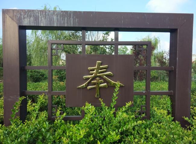 “奉”的基本釋義是獻(xiàn)給。其字的組成是由上半部分的“人”加三橫組成,“三”字又代表“多”,“多”也有“無窮無盡”之意,我們僅從字面上理解是人多的意思;“奉”字的下半部分是由出了頭的“土”字組成,隱喻當(dāng)年農(nóng)建四師萬名官兵響應(yīng)毛澤東生產(chǎn)待命、建設(shè)農(nóng)場(chǎng)的號(hào)召,來到黃海之濱這塊鹽堿遍布、雜草叢生的土地下,通過勇于奉獻(xiàn),已經(jīng)在這里深入了基層,扎下了根,立下了足。