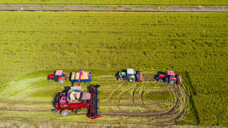 高空俯瞰,新洋的稻田格外俊俏,廣大干群正搶抓晴好天氣,組織人力、農機,加緊收割水稻,一臺臺大型聯合收割機開足馬力穿梭田間,所到之處,水稻盡數倒下,切割、脫粒、粉碎秸稈一氣呵成,吐出的稻谷顆粒飽滿,空氣中彌漫著陣陣稻香,好一副醉美田園風光!
