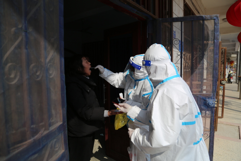 3月5日,連云港市海州區(qū)通報(bào)發(fā)生新冠肺炎疫情,形勢十分嚴(yán)峻。崗埠上下迅速行動(dòng)起來,按照要求組織開展全員核酸檢測。全員核酸檢測要求一天內(nèi)對崗埠所有在家人員進(jìn)行檢測,農(nóng)場四個(gè)點(diǎn)位同時(shí)開始,負(fù)責(zé)檢測的人員特別緊張。馬素蓮得知這一情況,主動(dòng)和相關(guān)人員溝通,暫停了自家門診,帶領(lǐng)醫(yī)生錢冬梅、護(hù)士錢明霞加入了振興廣場籃球場監(jiān)測點(diǎn)的核酸檢測人員隊(duì)伍。從3月5日到11日,她們?nèi)艘恢眻?jiān)守在核酸檢測一線,每天檢測人員合計(jì)達(dá)到兩三千人。有時(shí)候,她們需要配合網(wǎng)格員深入鎮(zhèn)區(qū)、生產(chǎn)區(qū)各居委會(huì)上門為行動(dòng)不便的人員進(jìn)行采樣,足跡遍布大街小巷,密不透風(fēng)的防護(hù)服常常讓她們滿臉通紅透不過氣來。護(hù)士錢明霞告訴筆者,3月11日當(dāng)天,她負(fù)責(zé)部分小區(qū)的核酸采樣工作,光是6樓就爬了6次,腿最后跟灌了鉛一樣,挪不動(dòng)。“有時(shí)候晚上嘴里吃著東西就睡著了。”