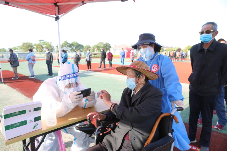 “請從這邊走!”轉業軍人、青年黨員孫強,標準軍人站姿導引著檢測居民有序進入,成為檢測中的一道風景。青年黨員趙珊、沈燕是一對好姐妹,由于連續的叫喊讓沈燕的嗓子嘶啞,今天她倆特意交換的分工?!斑@隊人少,請到這隊來!”接過好姐妹手中的大喇叭,趙珊大聲招呼著,將進入檢測區的居民有序分流到3個采樣區。“你們在這里等我會兒,我先幫你們登記?!?/span>換成維護秩序后,沈燕時刻關注著檢測的人群。70多歲的王奶奶家住劉圩小區,獨自一個坐著電動輪椅來到劉圩居委會核酸采樣點。沈燕見狀立刻上前引導她來到綠色通道,熱情地幫助她登記信息。不到5分鐘,王奶奶就完成了采樣。沈燕又小心地把她帶到了檢測出口。細心的黨員孫偉,在檢測中發現有不少行動不便的老人。今天他提前借來了一輛輪椅,看到年老體邁的老人,他就主動迎上去,把老人推進檢測綠色通道,從掃碼測溫到登記采樣,再到出口離開,最后把老人安全地交到老人家人手中。