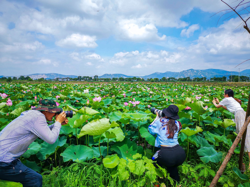 市區為“荷”而來的游客穿行在荷田之中,邊聞著沁人的花香,邊用攝影設備興致勃勃地拍照,大家不斷地調整角度、尋找機位,只為拍攝出荷花最傲人的身姿。