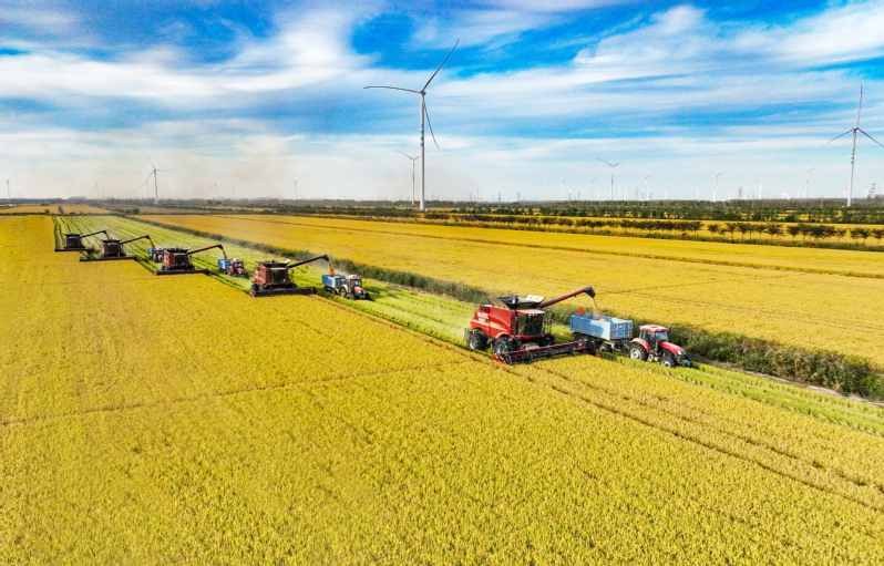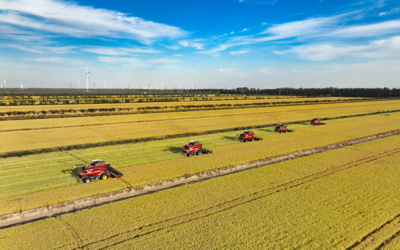2023年10月28日,在蘇墾農(nóng)發(fā)新洋分公司新南生產(chǎn)區(qū)19大隊(duì)的高標(biāo)準(zhǔn)農(nóng)田上,五臺(tái)凱斯7088大型聯(lián)合收割機(jī)穿梭在稻田中搶收水稻。蘇墾農(nóng)發(fā)新洋分公司搶抓晴好天氣,發(fā)揮農(nóng)墾企業(yè)機(jī)械化優(yōu)勢,確保秋糧顆粒歸倉。