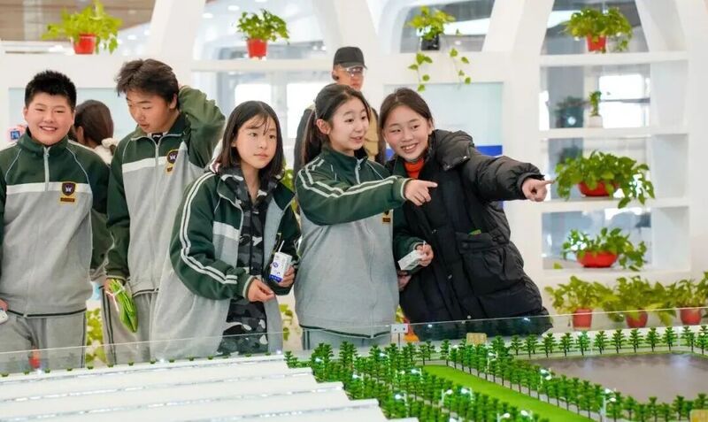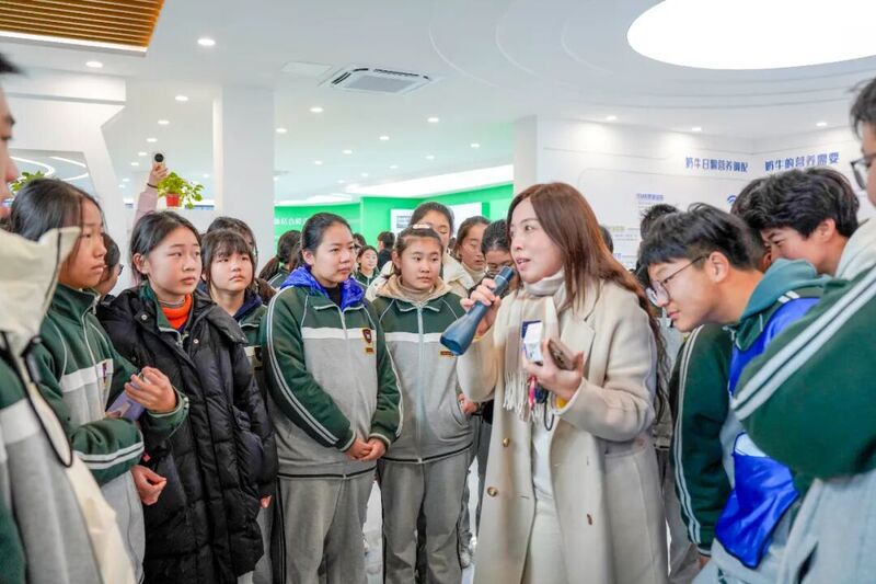 “原來奶牛是這樣擠奶的!太神奇了……”在可視化擠奶廳里,師生們的驚嘆聲此起彼伏。兩座全自動轉盤式利拉伐擠奶機正在運轉,一頭頭黑白花奶牛有序走上轉盤,擠奶員則熟練地進行著前藥浴、驗奶、套杯、后藥浴等標準化操作,整個流程清晰直觀地呈現在眾人眼前。“老師,這些奶牛每天能產多少奶呀?”一名戴眼鏡的男生舉手提問。講解員小張笑著解答:“一頭牛最高可以產70公斤牛奶,產出的牛奶都要經過100多項指標檢測,達標合格后才能走向市場?!痹谥腔刍鷳B展廳,師生們既能通過圖文展板系統學習奶牛品種特性、科學飼養方法及飼料配方等基礎知識,又能通過蘇墾乳業數字牧場展示平臺實時查看每頭奶牛的身份檔案、生長曲線、產奶數據及健康監測指標,沉浸式感受科技為傳統養殖業帶來的變革?!斑@次研學真是讓我親眼看到了科技養牛的力量,原來一杯好牛奶的誕生背后,藏著這么多學問!”一位帶隊老師感慨道。