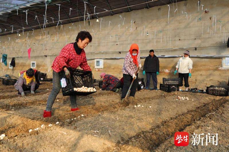 清晨,第一縷陽光穿透薄霧灑向連云港市海州區崗埠農場高效農業示范園,28號溫室大棚內暖意融融,近20名工人分工協作,鋤溝、擺種球、栽種、培土……動作嫻熟、銜接緊密,一派熱火朝天的勞作景象,為今冬海州“美麗經濟”續寫著增收新篇。