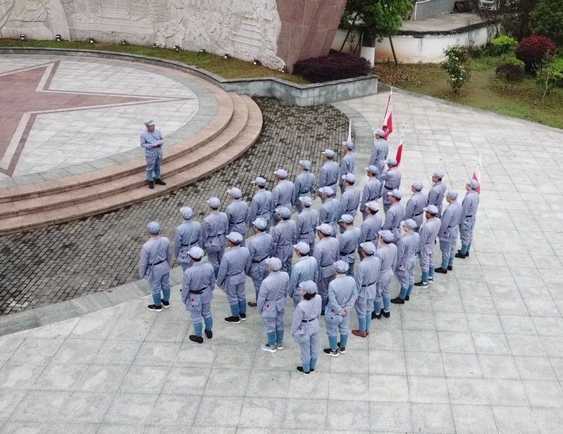 在毛澤東書(shū)寫的星星之火可以燎原大型浮雕前,孫國(guó)祥帶領(lǐng)大家一起高唱國(guó)歌,并在音樂(lè)聲中,向班級(jí)軍旗手及四個(gè)縱隊(duì)軍旗手進(jìn)行了授旗儀式。