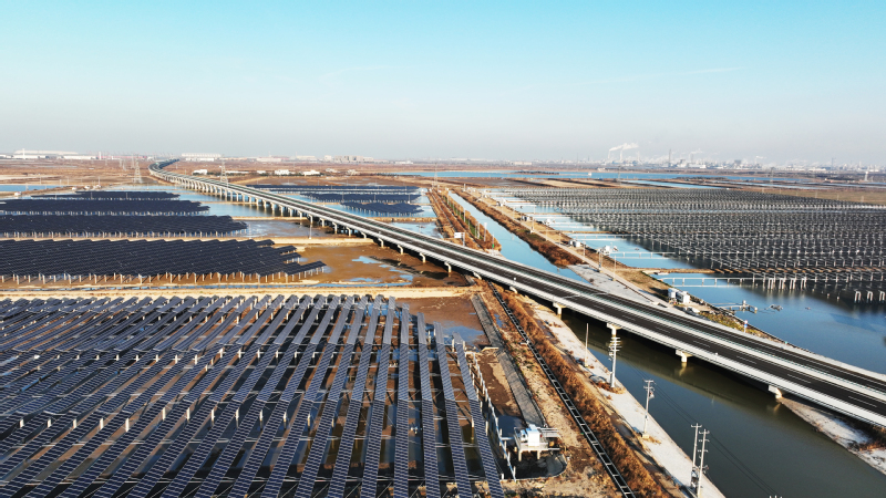 圖為江蘇農墾東辛農場實施的2580畝漁光一體集中式光伏發電項目,年發電量約1.48億千瓦時。