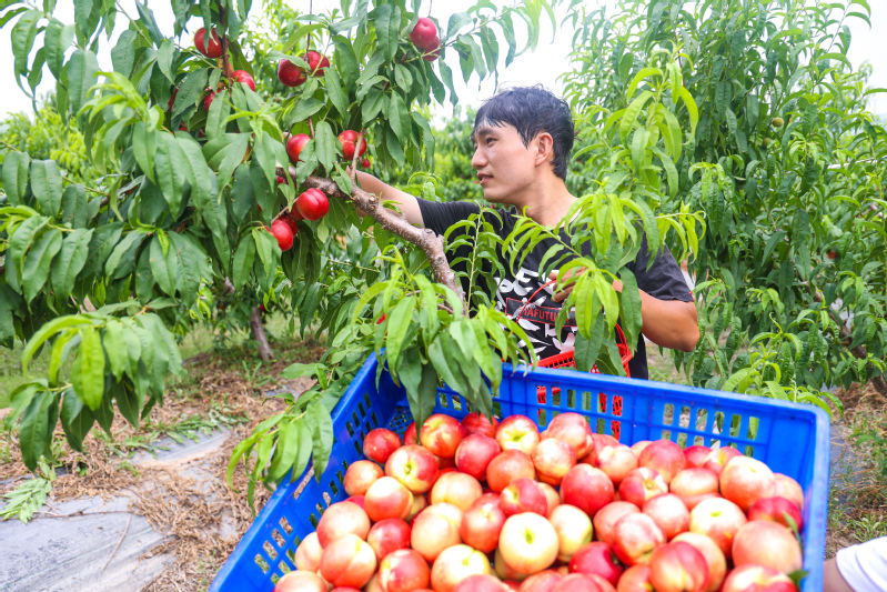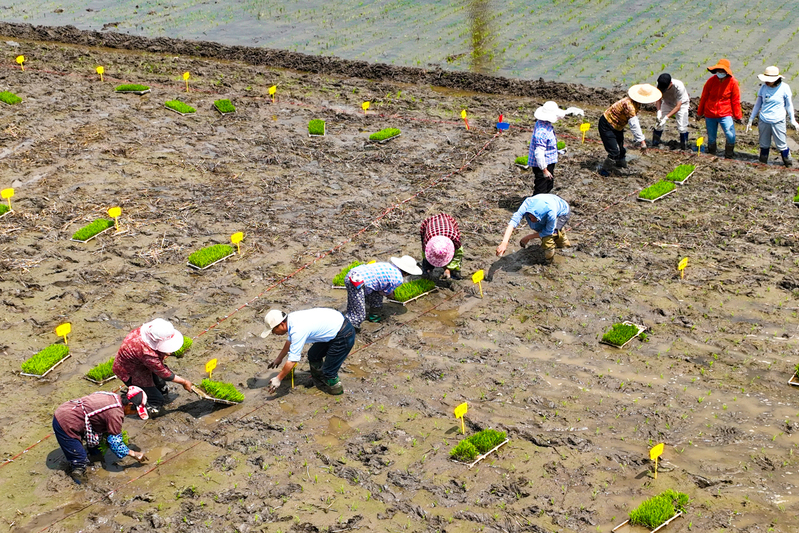 端午假期第一天,蘇墾農(nóng)發(fā)南通分公司3大隊(duì)田頭一片忙碌景象。烈日下,7位農(nóng)技人員彎著腰在水稻田一字排開移栽秧苗,腳下步履維艱、鼻頭汗珠滴落。按照隊(duì)伍兩頭農(nóng)技人員手拉的直線,他們小心翼翼地從秧盤上取下秧苗,左手握苗,右手插秧,確保行距25厘米,株距20厘米,每穴2株,橫豎成線、深度適中。每隔一段距離,田間都會(huì)插上一塊寫明實(shí)驗(yàn)數(shù)據(jù)的標(biāo)簽。“不同的標(biāo)簽對(duì)應(yīng)了不同的試驗(yàn)稻種。人工插秧可以確保水稻增產(chǎn)試驗(yàn)的科學(xué)性、嚴(yán)謹(jǐn)性、準(zhǔn)確性。”蘇墾農(nóng)發(fā)南通分公司農(nóng)業(yè)中心主任趙中華表示。今年,蘇墾農(nóng)發(fā)南通分公司大力推進(jìn)農(nóng)業(yè)科技創(chuàng)新,與南通大學(xué)生命科學(xué)學(xué)院合作開展水稻高產(chǎn)技術(shù)研發(fā),為南通稻米產(chǎn)業(yè)供給性結(jié)構(gòu)優(yōu)化、品質(zhì)提升、節(jié)本增效和綠色高產(chǎn)提供技術(shù)支撐。前期,校企雙方分別對(duì)南粳46、南粳5055稻種以微波、離心、超聲波等3種方式,按時(shí)間長(zhǎng)度各進(jìn)行32種處理。落谷前,蘇墾農(nóng)發(fā)南通分公司對(duì)不同品種、不同處理的水稻種子提前進(jìn)行了篩選、收集、稱重、貼標(biāo)、裝袋等準(zhǔn)備工作,同時(shí)與相關(guān)農(nóng)業(yè)大隊(duì)溝通協(xié)調(diào)好浸種催芽時(shí)間,在種子露白后及時(shí)安排工人與農(nóng)機(jī),掌握好落谷的最佳時(shí)機(jī)與最優(yōu)質(zhì)量,控制種子秧盤播撒的均勻度,精準(zhǔn)把控好土壤濕度與精細(xì)